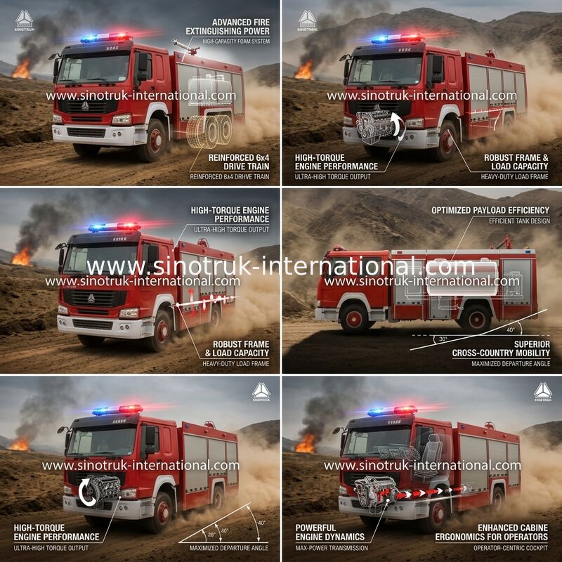 1) Le camion de lutte contre l'incendie de SINOTRUK ont la puissance forte, temps d'accélération court, structure compacte, l'espace d'occupant, bas plancher, commode pour fournir de personnel en marche et en arrêt.